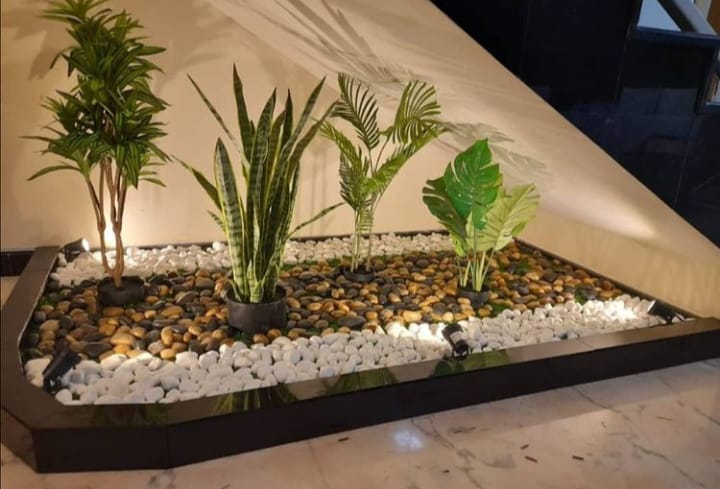 ديكورات حجريه وتصميمات بأشجار صناعيه أسفل الدرج مما يعطي مظهر رائع لمنزلك نختار الأشجار الصناعية بألوان رائعة .